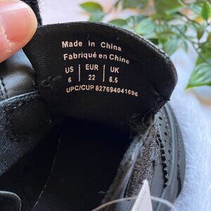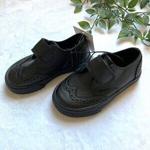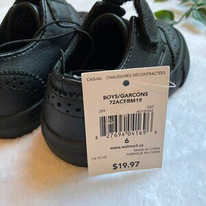 George toddler boys' dress shoes, size 6. Faux leather with rubber soles. Classic black oxford style with wingtip brogue detailing and easy hook-and-loop Velcro strap for quick dressing.