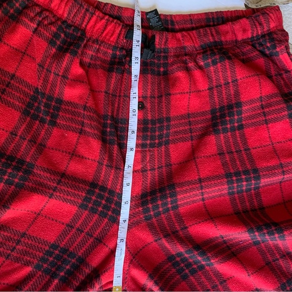 Details - grey and black long sleeve fleece top, red and black plaid bottoms