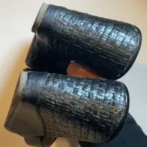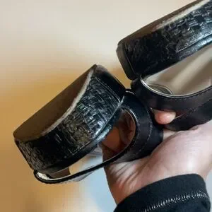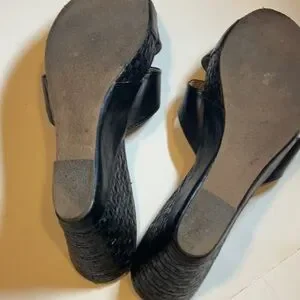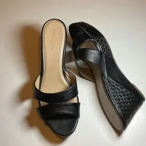 Chic black wedges with a stylish woven pattern. Double front straps Weave pattern on wedge Minor wear marks