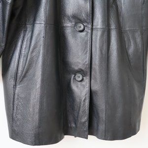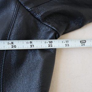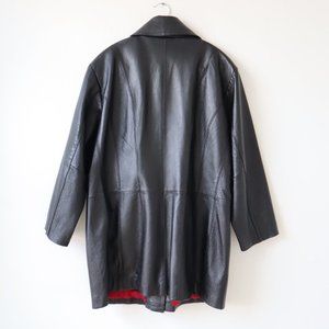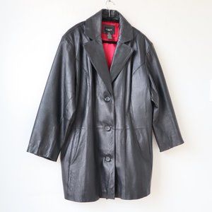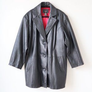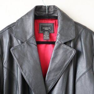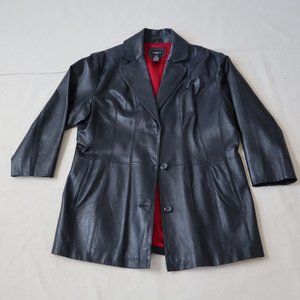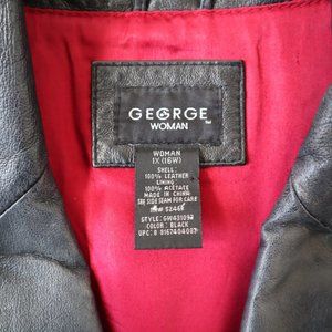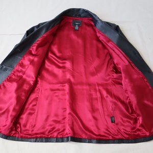 Super on-trend leather piece from George Woman. Black leather blazer-style jacket with button closures. Lined with beautiful red acetate. Front pockets.