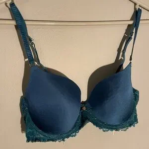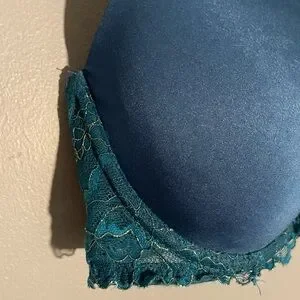 Blue bra with green lace and gold highlights.