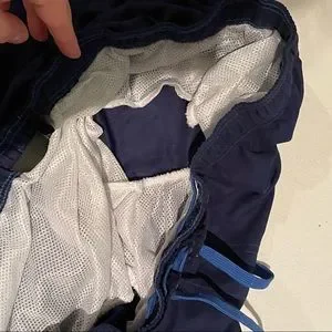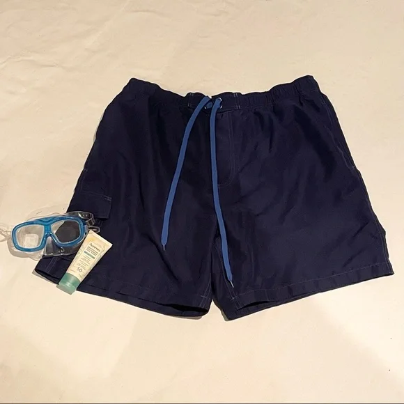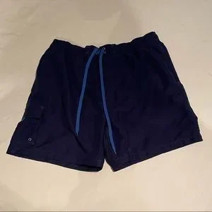 Navy blue George swim trunks with mesh lining and pockets. Elastic waist band with lace up fly. Good used condition, no notable flaws. Nice and lightweight.