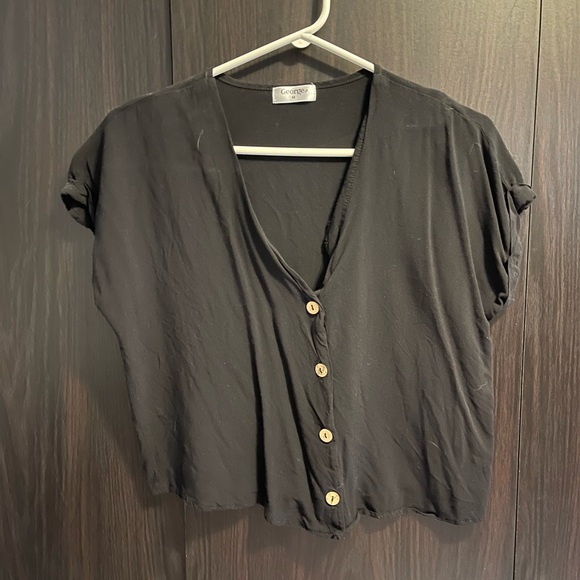 Chic black button-down shirt by George. Features short sleeves and a stylish V-neck. Perfect for versatile styling.