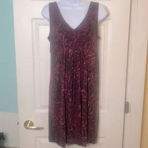 George V-Neck Dress there is no tag to describe the fabric. It feels soft and flowie thicker t-shirt type fabric.