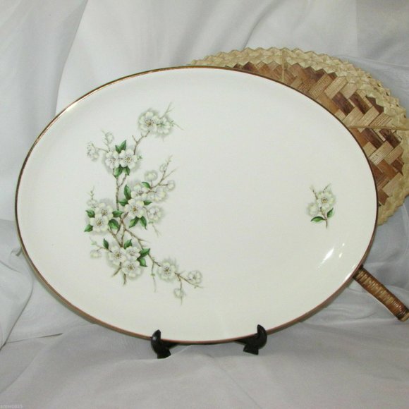 Spring Blossom by Georgian China, U.S.A. - White flowers, smooth 22 KT gold rim. Measures about 13 3/8" long x 10 1/4" wide.