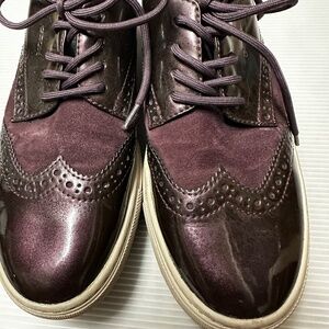 Geox Respira Grape/wine/purple lace-up Oxford, patent Italian leather flats. Size 38, beautiful grey colored trim, black Geox breathable nonslip soles, mix of patent leather and suede, wingtip. Length- 10 1/4" inches toe to heel