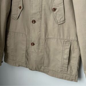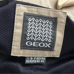 Stylish military jacket by Geox. Features double zipper and snap closure. 4 pockets in front, on interior pocket with headphone cord grommet. Zipper in collar hides a hood. Back flaps have snaps and adjustable snaps at cuffs.