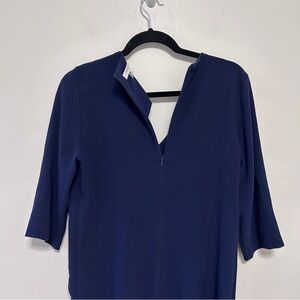 This sophisticated blue sheath dress by Gerard Darel features a flattering V-neck and 3/4 sleeves, perfect for work or cocktail events. The asymmetrical design adds a modern twist to its classic silhouette, making it a stylish choice for any occasion. I believe this is new without tags as there is a boutique price tag on the bottom of the dress hem.