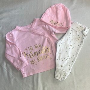 Gerber - Soft Pink Newborn "Princess" top, pants, and hat set w/ gold design