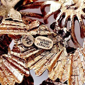 The marks on the brooch indicate that it is a vintage or antique piece made in Germany, coated with a durable layer of 10-karat gold over a base metal. The number "247" is most likely a manufacturer's or inventory mark.