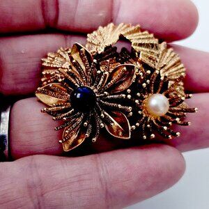 This brooch has a Lapis and real Pearl as focal centers for the flowers.