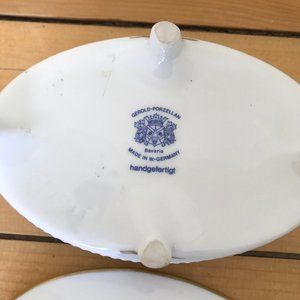 Gerold-Porzellan oval footed trinket box has a pretty floral bouquet design around the sides & on the lid. 5" long x 3 1/4" wide x 2" tall. Made in Germany. Pre-owned condition, some wear marks to bottom surface & smudge marks on the rim from use.