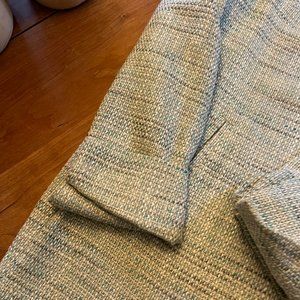 Amazing condition. Mint green, light gray and white woven fabric. Lightweight. Unlined. Folded cuffs with no button closures at the cuff. 2 slit pockets. 2 button closure. Sleeves stop short of the wrist when worn. Size fits like an 8 but no size or fabric identification tags include on the garment. Previously worn