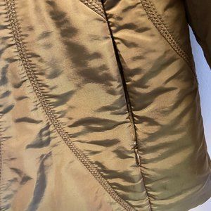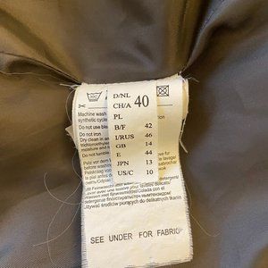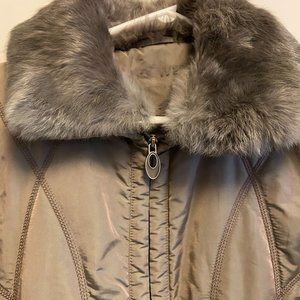 Warm yet very lightweight and attractive zip up jacket with hidden zipper pockets, detatchable rabbit fur collar, one inside pocket. Colour is a light brown to a greyish olive green so difficult to describe! Has interesting stitching. 100% polyester lining, outside is 51% polyamid/nylon and 41% polyester. Size 10/ Euro size 40, would fit size 8. LOVE this jacket but no longer fits!