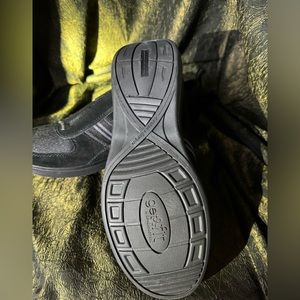 Black suede and fabric, super cushioned, zip front shoe. 1.5 inch wedge heel.
