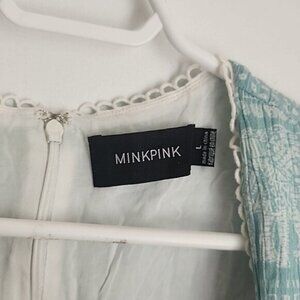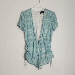 Step out in style this summer with the MINKPINK Getaway Drawstring Romper Playsuit. The beautiful turquoise color with elephant print and shirred sides with tie detail make this romper a must-have for any fashionista. With a comfortable drawstring waist and made of 100% viscose, this romper is perfect for hot summer days. Hand wash cold for easy care. Purchased from REVOLVE, you can be sure of the quality and style of this piece. Available in size Large, this romper is perfect for any summer getaway or beach day. Make a statement with the MINKPINK Getaway Drawstring Romper. Flat measurements: Bust: 22 inches Waist: 15.5 inches Length: 29 inches Inseam: 2 inches box38