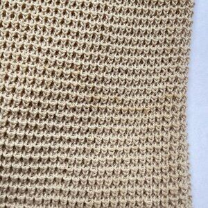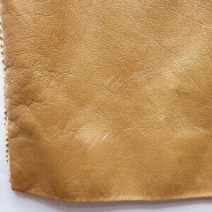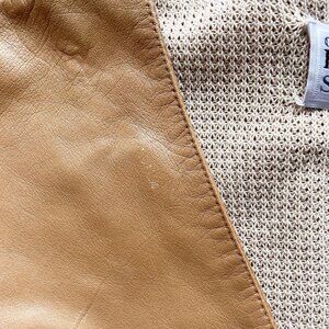 Condition: Fair. There's a small hole on the arm, the color has lifted from the leather in a few areas, and there are some light yellow marks on the back of the knit. It's possible that a dry-cleaner can remove them. Please carefully review the photos.