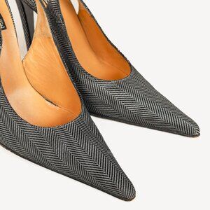 These heels from Gianfranco Ferre are crafted in a metallic silver and black herringbone fabric on the upper, and feature covered stiletto high heels, closed pointed toes, elasticized slingback straps with bow detailing, and leather lining and soles.