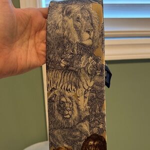 Distinctive tie with a bold wildlife design. Features majestic lions in blue and brown tones. Ideal for a refined look.