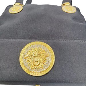 Medium sized handbag with gold tone medusa head hardware and gold tone chain. Top zip opening with one inner zip pocket. Made in Italy. In good condition.