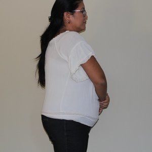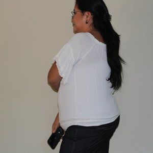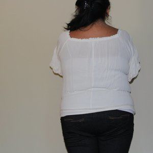Tons of stretch, worn twice, very beautiful top, I am a 48-inch bust, no tears or wear to item, just been sitting at the back of my closet for over 2 years. Purchased from Giant Tiger, size Large.