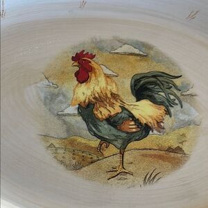 Charming oval platter with a vibrant rooster design. Features a green rim. Perfect for serving or display. No chips
