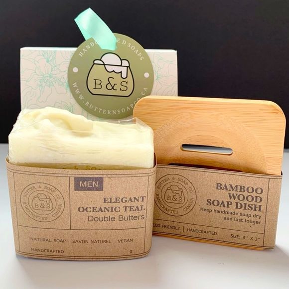 The body soap is All Natural MEN Elegant Oceanic Teal Double Butters Soap Bar made with 15% Shea Butter and 5% Cocoa Butter scented with Morocco Cedarwood Oil and Oceanus fragrance oil. The combination of the smell create a warm, camphorous aroma with sweet woody-balsamic undertones with fresh and slightly salty feelings.