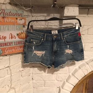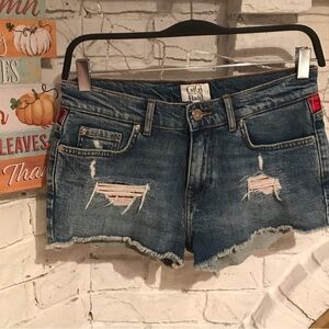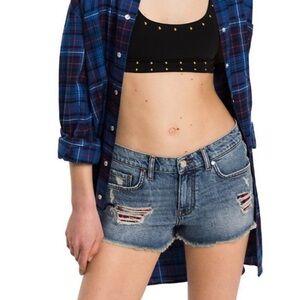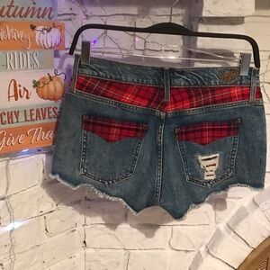 Gigi Hadid X Tommy Hilfiger Collaboration Denim Shorts. Colour is a medium blue denim wash with distressing detail and adorable red flannel check pattern plaid detail underneath the distressing and in the back on the pockets, such a cute detail for the fall!