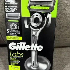 Brand New Gillette Labs razor with exfoliating bar and stand. Sleek black and silver design.