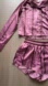 Stylish and cozy pink pajama set featuring white and purple stripes. The top has a button-up front and chest pocket, paired with matching bottoms for a coordinated look.