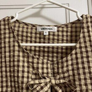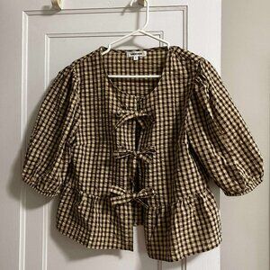 Front tie, peplum, puffy sleeve, gingham tie top. NWOT. Size Large.