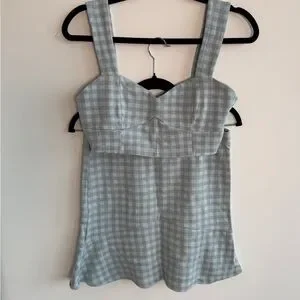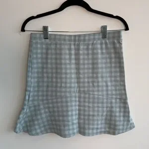 Matching soft blue gingham set featuring a crop top with wide straps and a coordinating mini skirt with a soft flare hem. The fabric has a lightweight feel that works well for warm weather, vacation, or summer events. The pieces can also be styled separately. Size L