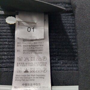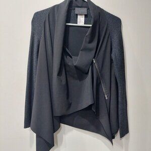 The cardigan features a draped open front, long sleeves with ribbed knit sections, and a zipper detail on the right side.