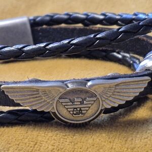 Giorgio Armani .Stylish black leather bracelet featuring a silver winged emblem. Perfect for adding a bold touch to any outfit. 8.1 inches long