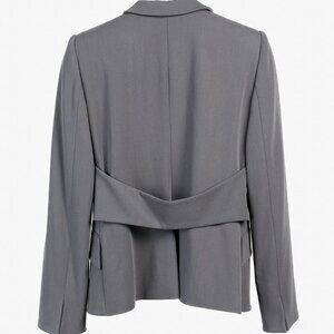 Expertly tailored and crafted from premium charcoal wool, this single-breasted Giorgio Armani blazer exudes sophistication and style. Accented with raised leather buttons, its elegant design includes 2 front pockets, split cuffs, and a wrapped-waist detail at the back that creates a peplum silhouette.