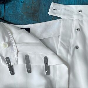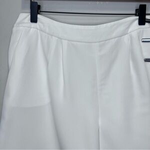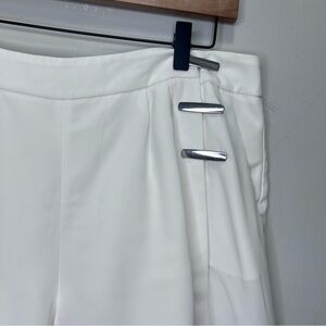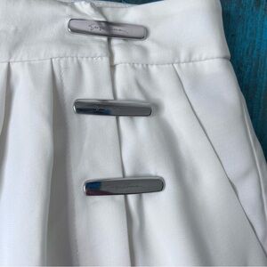 Smooth knit.Waistband sits at natural waist.Left front side has bar-detailed snap closures.Right front side has soft pleats.Fitted waist with relaxed hips.
