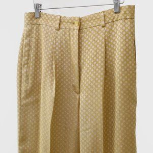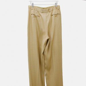 A pair of vintage Giorgio Armani high-waisted pants in gold jacquard-woven fabric with a repeating crosshatch pattern, featuring a wide leg silhouette with a decorative middle crease, two front pockets, rear welted button pockets, belt loops, and a gold-embellished button with fly closure.