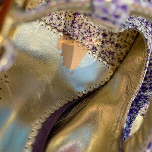 Giorgio Piergentili 3 inch sling back heel with peep toe, t strap and mirror finish gold accents. Lots of look in these barely worn shoes with unusual splatter pattern of imperial purple and gold on a cream background, Italian made in real leather. Mixed sizes plse note: right sz 36, left sz 37. A dramatic shoe choice for winter whites, anything purple. We like these with deep indigo jeans and a beaded top for club or date night. Style it your way with additional picks from Our Closet (some suggestions shown all listed and priced separately), make a bundle to save a bundle. Luxury look on a budget, for you from Lemon Squeezy Shop🍋