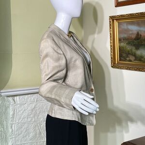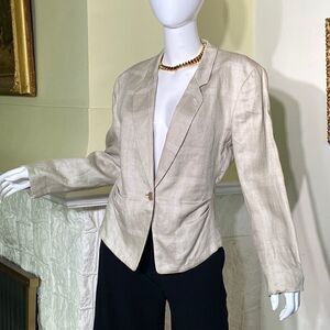 In very good preowned condition classic Giorgio Armani linen tuxedo style jacket. Heavy shoulder pads, fitted at the waist with flattering gathering to single button closure.