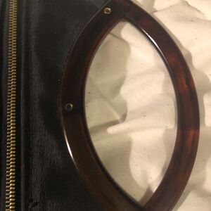 This clutch is to die for! This unique, vintage Giorini Clutch had Lucite handles. Perfect fit for cell phone and wallet. Beautiful accessory! Navy in colour with brown handles. Excellent used condition.