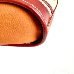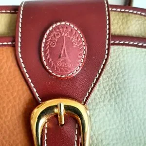 Super cute multi color Giovane Paris adjustable shoulder bag with goldtone buckle accent. Flap snap top closure, front slip pocket and back zip pocket. Single compartment with top zippered closure. Interior with double zippered pockets. Used in good condition. Some tiny mark on back upper right corner and slight discoloration on back pocket edge inner lining. Does not affect the beauty of the bag. See all pictures for detail.