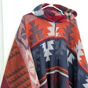 This poncho features striking orange and blue accents in a bold geometric pattern, inspired by southwestern designs. The angular shapes and vibrant colors create a captivating visual contrast, enhanced by the fringe detail along the bottom edge.