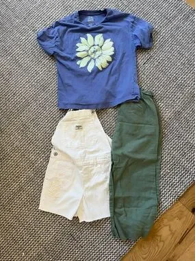 Soft blue tee with a large yellow sunflower graphic on front. Oshkosh overalls with beige embroidery. GAP wide leg pants. Sizes 7/8. Overalls size 7.