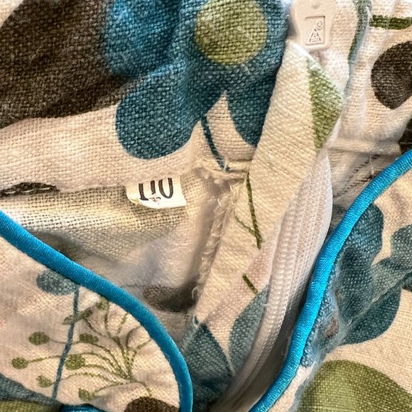 - Floral pattern with blue trim and embellishments