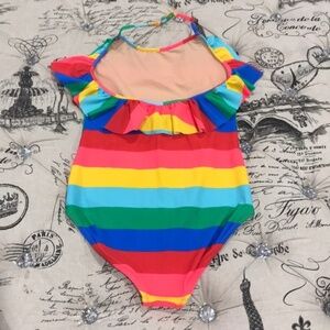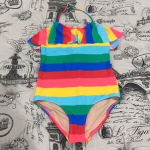 Bright rainbow-hued stripes and a flouncy ruffle define a supercomfy swimsuit perfect for cannonballing, boogie boarding and endless games of Marco Polo.