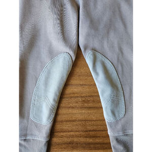 These Elation Red Label riding pants, youth size 8, are beige/tan with contrasting knee patches and zipper trim. Constructed from 95% cotton and 5% elastane, they feature a front zipper closure with hook-and-bar fasteners, belt loops, and a zippered front pocket. The knee patches have decorative stitching, and the ankles are finished with ribbed cuffs. Minor fabric pile on fabric of zipper as seen in photo.