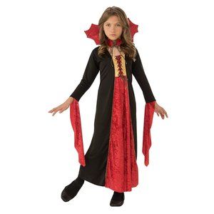Your little girl can be an elegant and sophisticated vampire this year. The Gothic Vampiress Child's costume is a floor length, black and red velvet dress. It laces up the front, has long draping cuffs, and a big stand up collar. This is the perfect combination of cute girl, grown up style, and vampire.