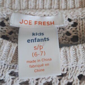 Adorable short-sleeve knit top for girls by Joe Fresh, size S/P (6–7). Features a light pink crochet-style open-knit pattern with geometric textures. Soft, breathable, and perfect for spring or summer layering. Slightly longer in the back for added style and comfort.