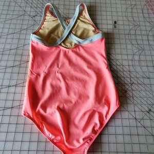 Girl's Lands End swimsuit in pink, light turquoise and pink. Size 14. Low leg openings and high racer back straps. Fully lined. Excellent used condition.