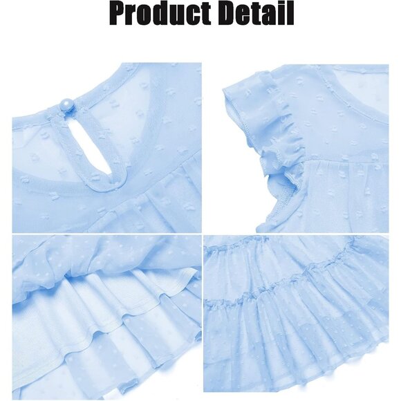 🆕Girl's Light Blue Polyester Swiss Dots Flared Sleeve Pleated Summer Dress